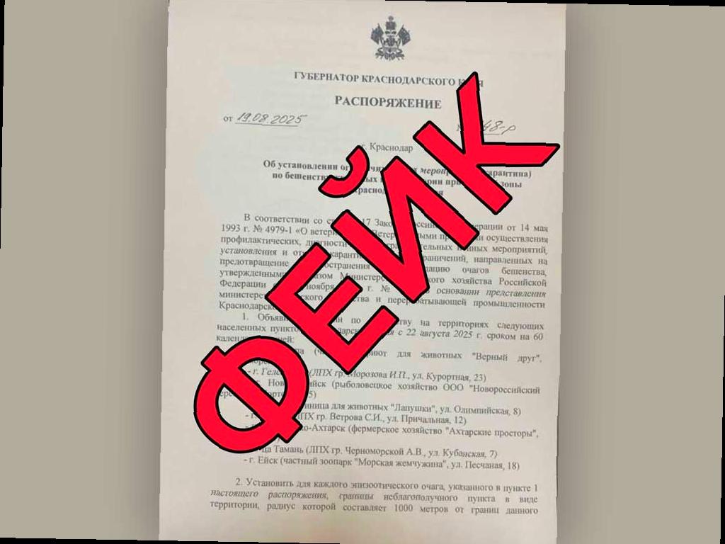 В оперативном штабе Краснодарского края сообщили о появлении ложной информации об установлении карантина по бешенству у животных в прибрежной зоне. По их словам, сообщения о том, что губернатор якобы ввел такие меры с 22 августа, являются подделкой.
