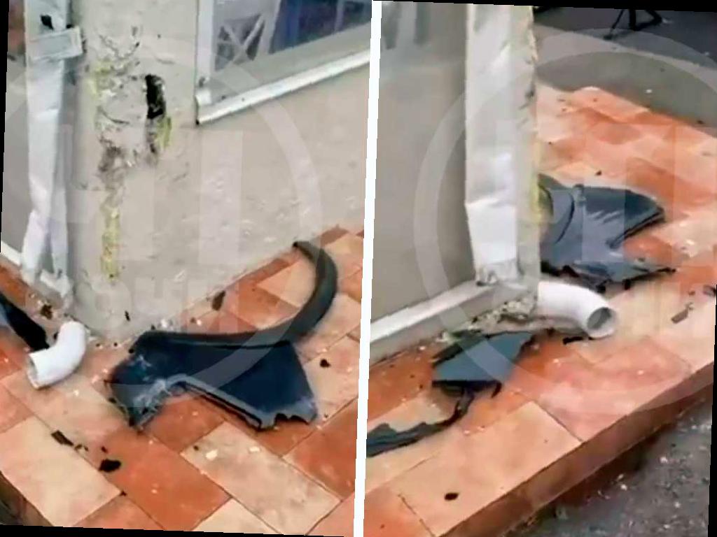 На фотографиях видно разбитую штукатурку и поврежденную водосточную трубу. Пластиковые обломки, разбросанные по полу рядом с поврежденным участком, по всей видимости, принадлежат крылу автомобиля.