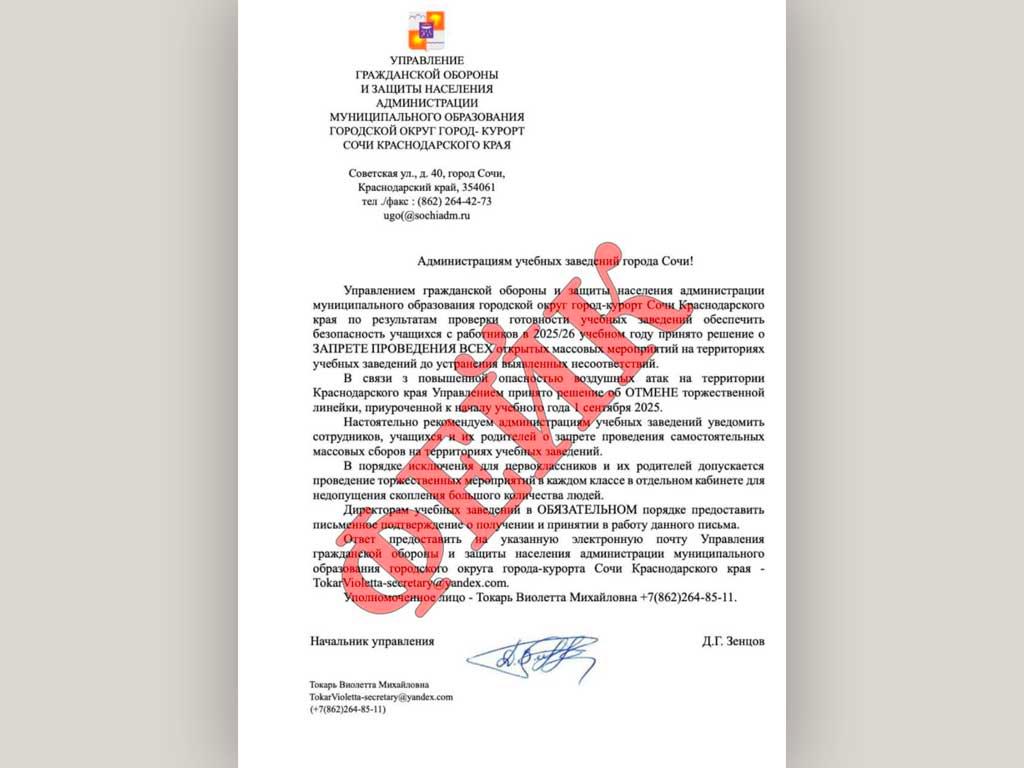 28 августа в соцсетях появилось сообщение о том, что все массовые мероприятия к началу учебного года отменены. Предполагаемое предписание было связано с управлением гражданской обороны и защиты населения администрации Сочи.