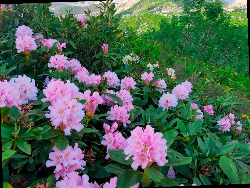Вместе с альпийской розой в горах цветут также краснокнижный кандык кавказский, рябчик широколистный. В ближайшее время к ним присоединится ярко-желтая лилия Кессельринга, а летом расцветут орхидеи и колокольчики. К осени можно будет увидеть шафран и безвременник.