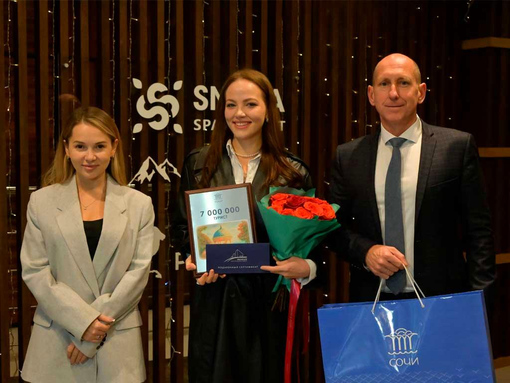 Семимиллионному гостю вручили сертификат и памятные подарки. По данным городских властей, поток туристов в Сочи в осенний период остается на уровне прошлого года. Загрузка гостиниц в сентябре составила 84,2%, а в октябре — 75,8%. На новогодние каникулы ожидается прибытие около 280 тысяч гостей и примерно 200 тысяч однодневных туристов.